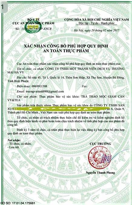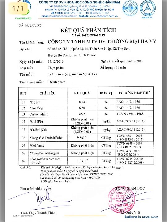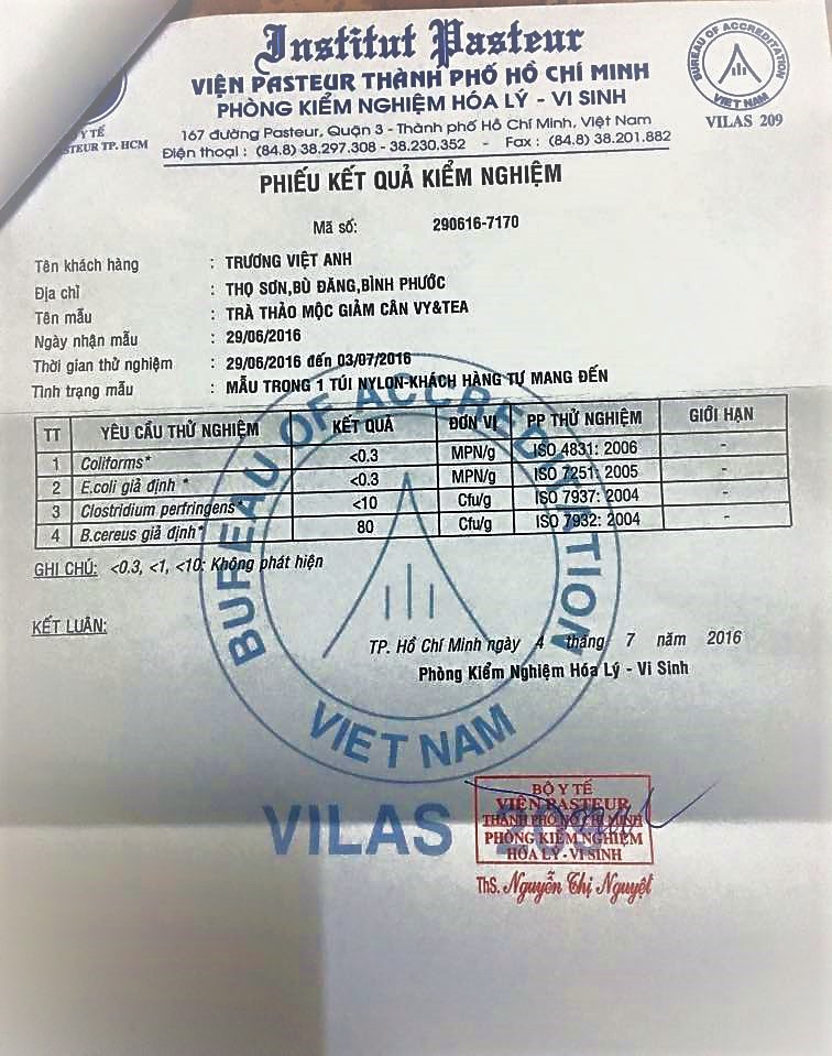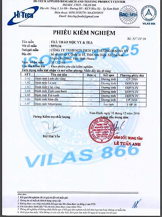 Một trong những sản phẩm hỗ trợ giảm cân an toàn và hiệu quả nhất – đã được kiểm chứng bởi Viện Pasteur TP.Hồ Chí Minh, Phòng Kiểm nghiệm Lý Hóa – Vi Sinh, đó chính là trà thảo mộc giảm cân Vy & Tea. Trà Vy & Tea được sản xuất bởi công ty TNHH Thương Mại Dịch Vụ Hà Vy – hiện tại đang là loại trà giảm cân được rất nhiều bài báo khen ngợi về tính năng và hiệu quả như